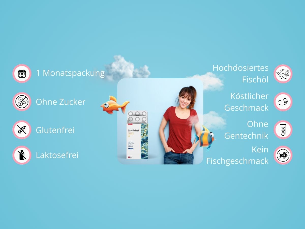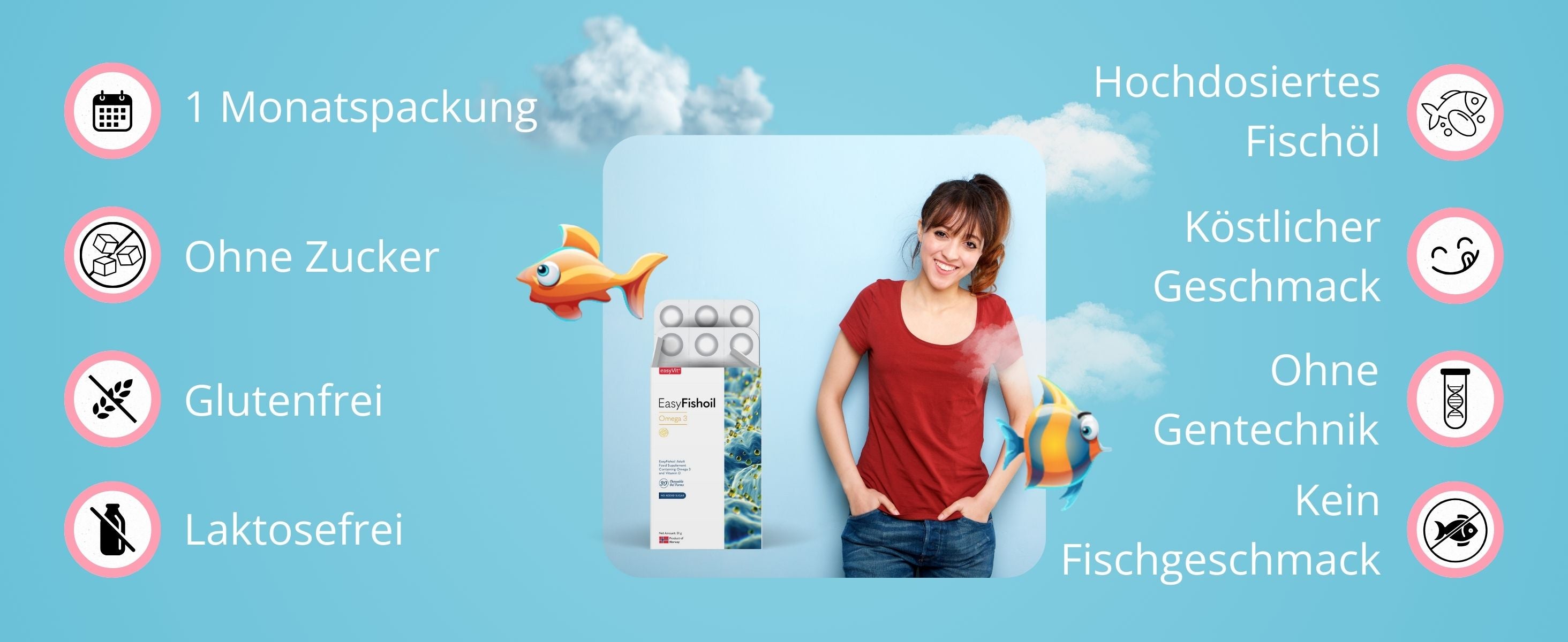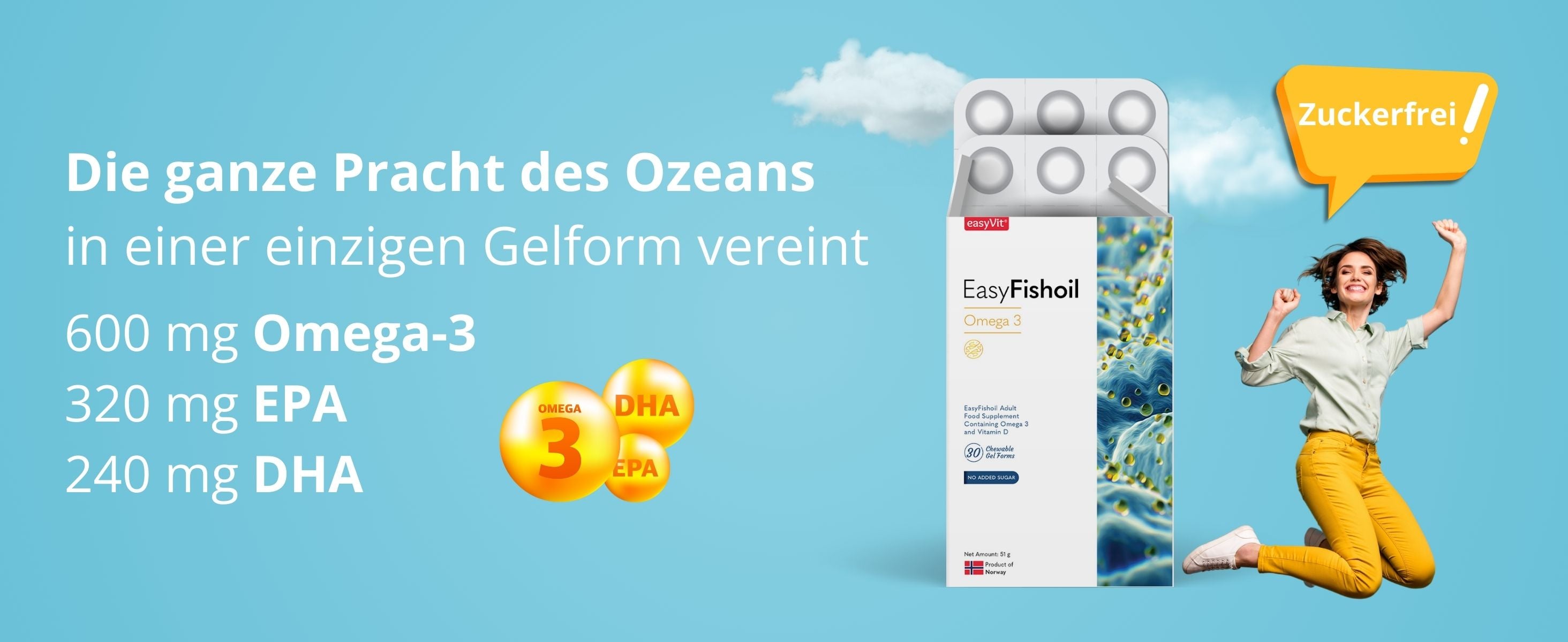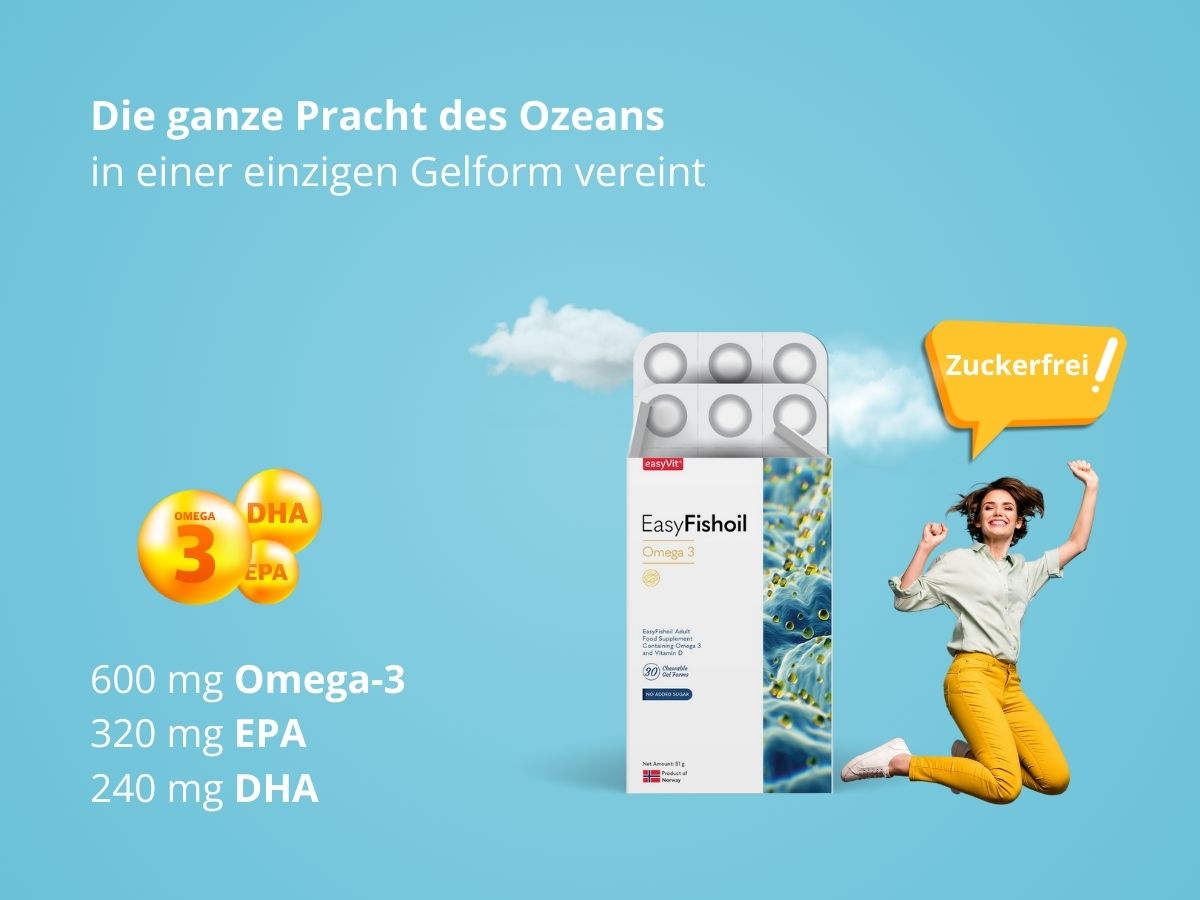 Per gli adulti che non vogliono ingerire compresse e non vogliono rinunciare ai benefici di EasyFishoil. Ogni compressa masticabile contiene Omega-3 con EPA (320 mg) e DHA (240 mg), che corrisponde alla dose giornaliera di Omega-3 raccomandata a livello globale per gli adulti. Questo prodotto non contiene zucchero, conservanti o altri additivi. Prodotto in Norvegia Il prodotto ha una biodisponibilità migliore del 44% rispetto alle capsule e, grazie alla tecnologia brevettata ConCordix®, non provoca disturbi allo stomaco, gonfiore o reflusso. Una confezione contiene 30 caramelle. Ogni pezzo è confezionato singolarmente e quindi protetto singolarmente dall'ossigeno e dall'umidità fino all'apertura. EasyFishoil è disponibile anche in farmacia.