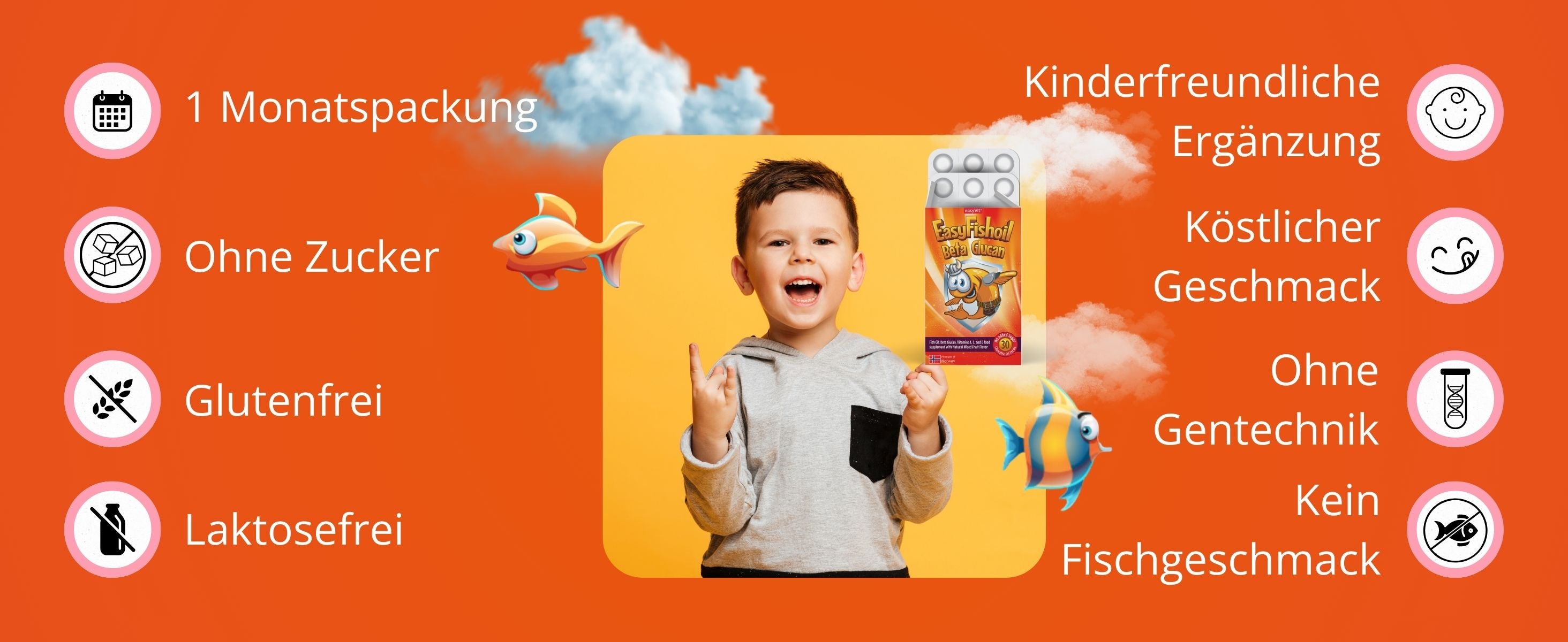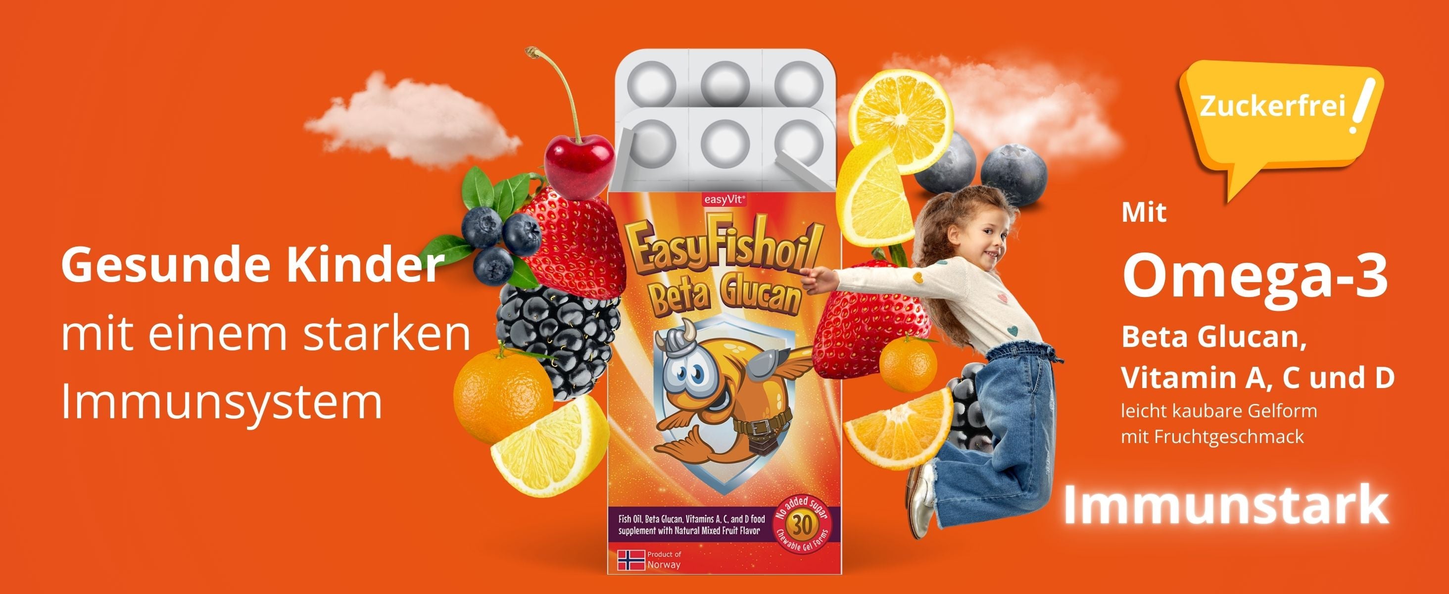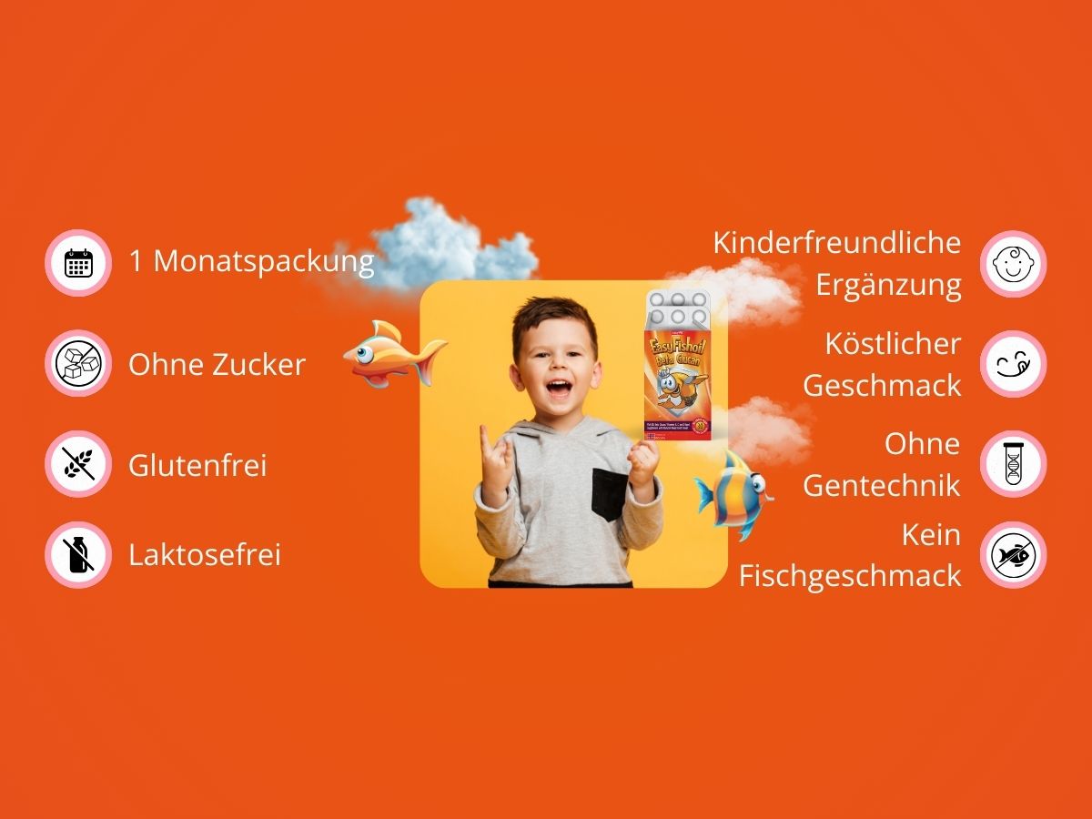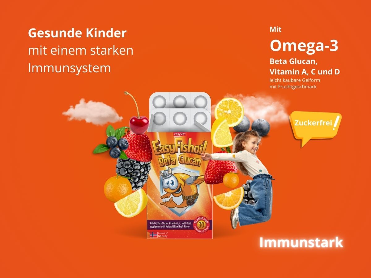 La dose giornaliera di Omega-3 con Beta Glucano per rafforzare il sistema immunitario del tuo bambino. Ogni masticazione contiene Omega-3 con EPA (150 mg) e DHA (100 mg), che corrispondono alla dose giornaliera di Omega-3 raccomandata a livello globale. Il beta-glucano contenuto al suo interno contribuisce inoltre a rafforzare il sistema immunitario. Oltre il 90% dei bambini ama il sapore e l'odore dei "tutti frutti". Questo prodotto non contiene zucchero, conservanti o altri additivi. Prodotto in Norvegia, il prodotto ha una biodisponibilità superiore del 44% rispetto alle capsule e, grazie alla tecnologia brevettata ConCordix®, non provoca disturbi allo stomaco, gonfiore o reflusso. Una confezione contiene 30 caramelle. Ogni pezzo è confezionato singolarmente e quindi protetto singolarmente dall'ossigeno e dall'umidità fino all'apertura. EasyFishoil è disponibile anche in farmacia.